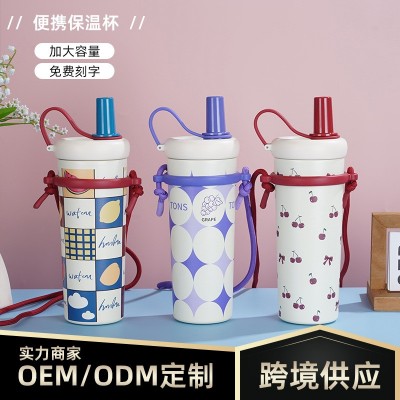 316不锈钢保温杯高颜值男女带提绳吸管杯大容量便携浮球儿童水杯