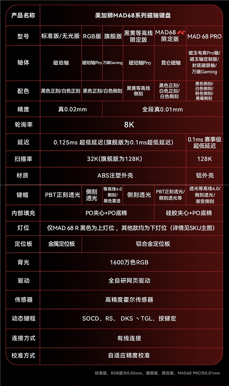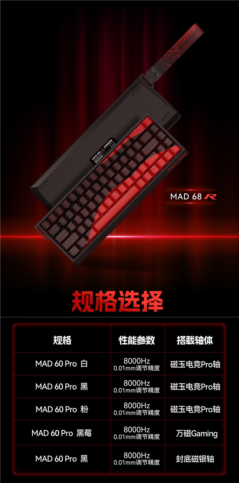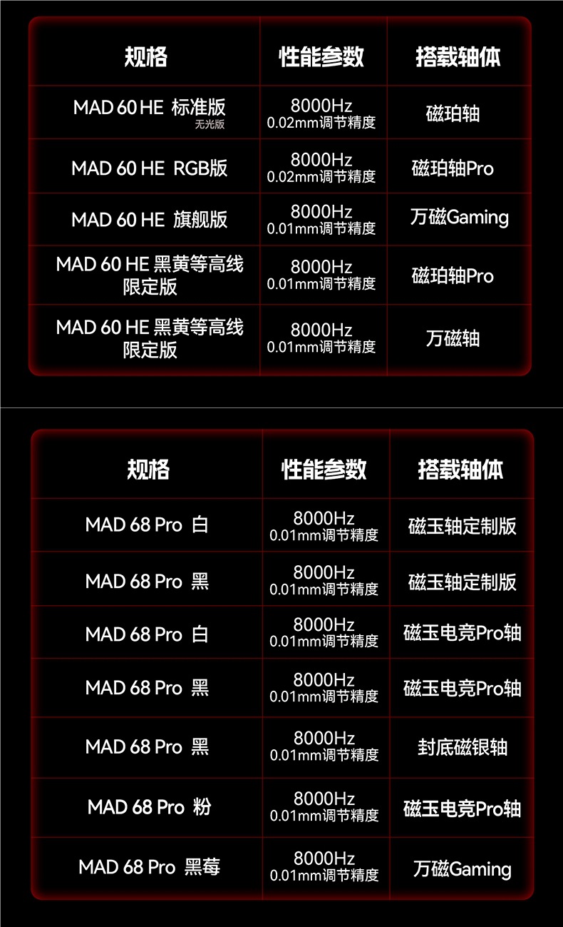 颜色MAD60 HE 黑色 RGB版 磁珀轴pro,MAD60 HE 白色 RGB版 磁珀轴pro,MAD60 HE 白色等高线4.0 旗舰版 万磁Gaming 侧刻,MAD60 HE 雾透黑 旗舰版 万磁Gaming,MAD68 HE 黑色 RGB版 磁珀轴pro,MAD68 HE 雾透黑 旗舰版 万磁Gaming,MAD68 R 黑色 性能版 昆仑磁轴,MAD 68 Pro 黑等高线 全铝外壳 磁玉轴定制版 侧刻,MAD 68 Pro 粉色渐变 全铝外壳 磁玉电竞Pro轴 侧刻,MAD 68 Pro 黑等高线 全铝外壳 磁玉电竞Pro轴 侧刻