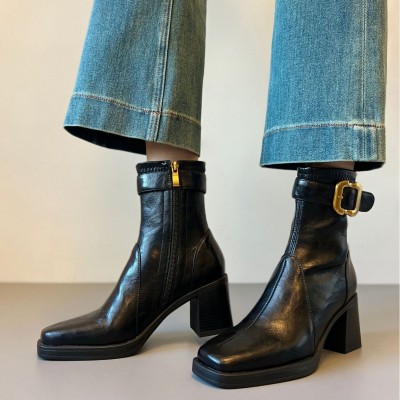 静音底方头高跟短靴女轻奢粗跟瘦瘦靴软面百搭显瘦靴子