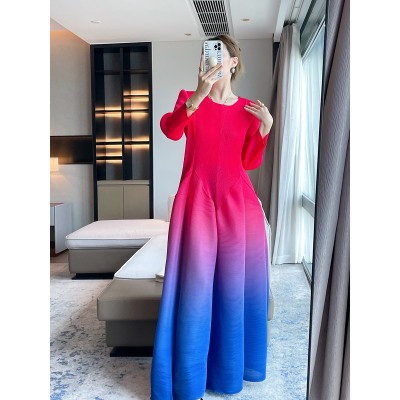 三宅2025秋季新款渐变色印花褶皱连衣裙通勤高级感收腰气质大摆裙